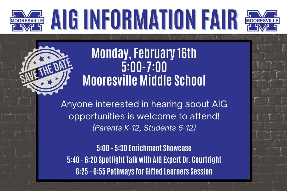 Dear Parents and Families,You’re invited to attend our AIG Information Fair on Monday, February 16 from 5:00–7:00 PM at Mooresville Middle School.Who is invited:AIG parents of students in grades K–...