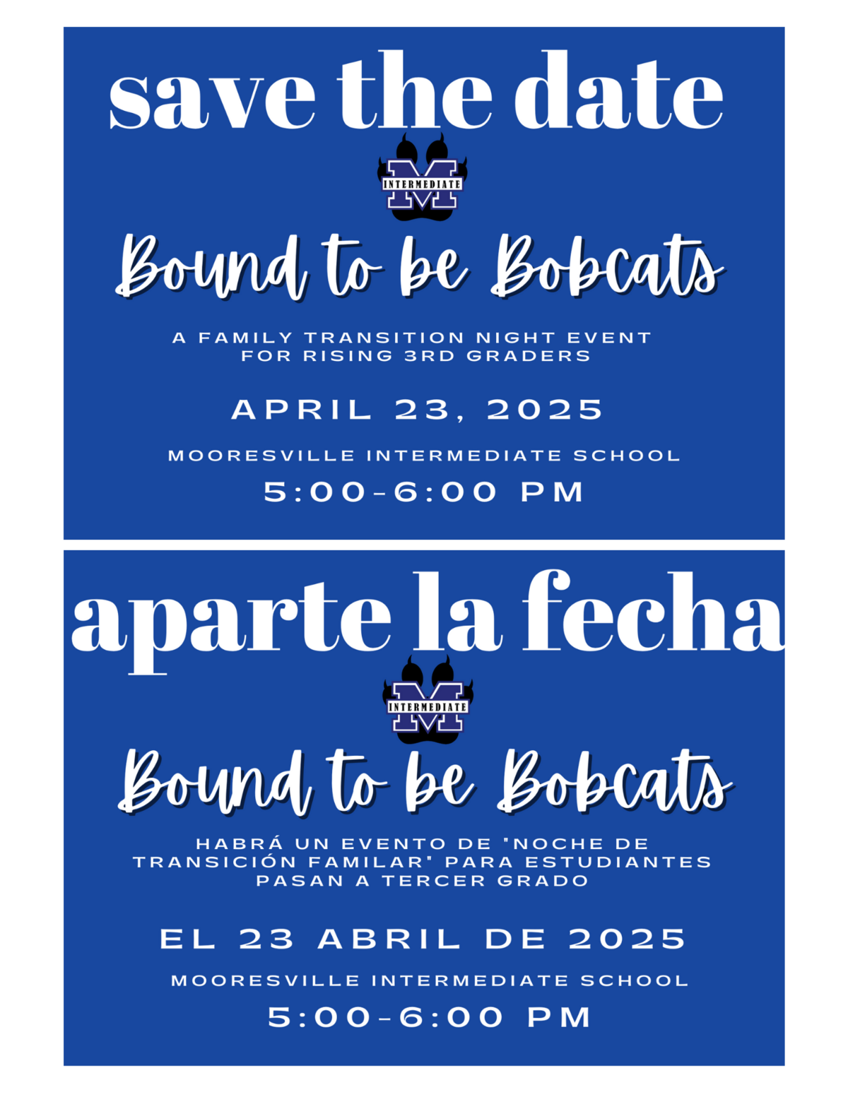 Will you be an MIS Bobcat? Join us on Wednesday, April 23 from 5:00 - 6:00pm at Mooresville Intermediate School, 1438 Coddle Creek Hwy, Mooresville, NC 28115.